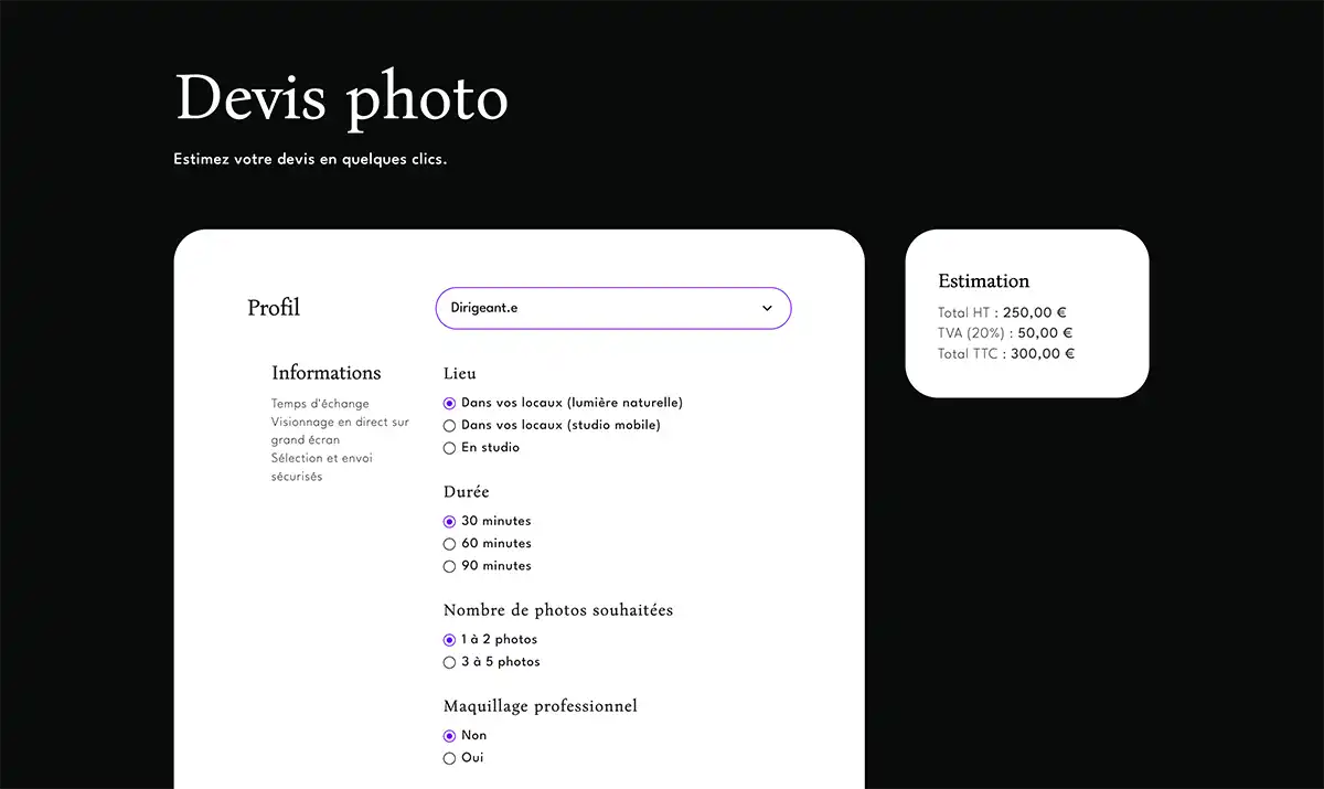 Que ce soit pour un portrait professionnel, une équipe ou un projet artistique, tout se calcule en temps réel, sans inscription ni échange préalable.